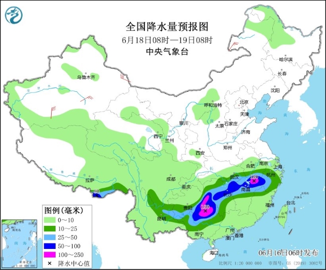 图5 全国降水量预报图(6月18日08时-19日08时)