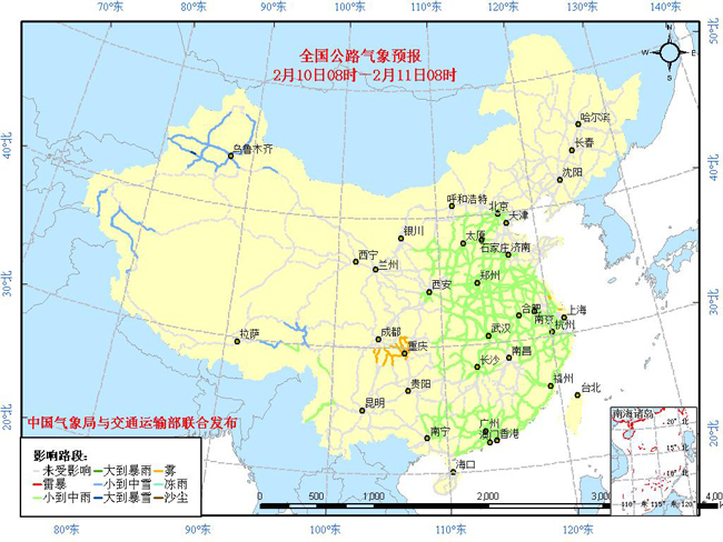 图3 全国公路气象预报图(2月10日08时-11日08时)