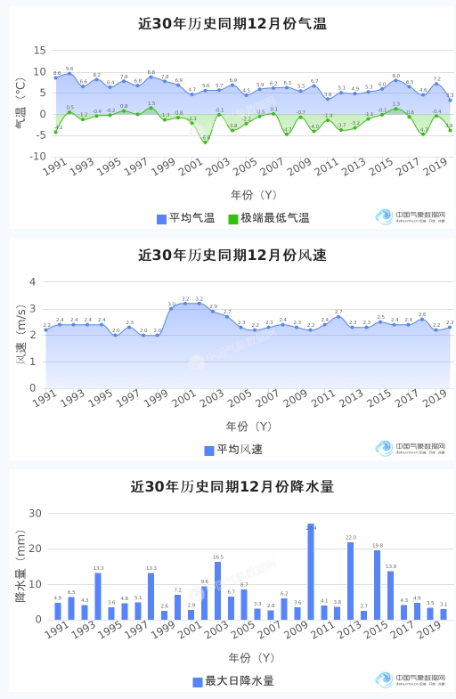 当地12月份历史平均气温5.4℃,12月份历史极端最低气温-13.1℃,12月份历史最大日降水量37.0mm,12月份历史平均风速2.1m/s。