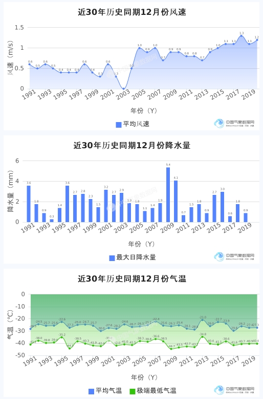 当地12月份历史平均气温-25.8℃,12月份历史极端最低气温-44.7℃,12月份历史最大日降水量5.4mm,12月份历史平均风速1.0m/s。