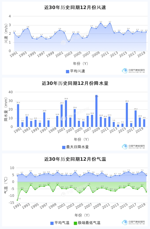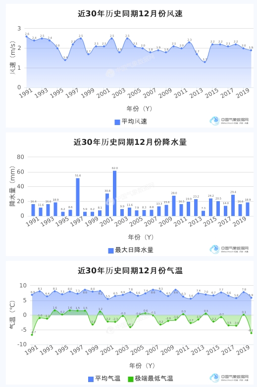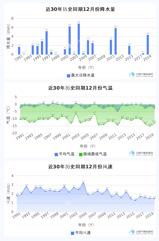 当地12月份历史平均气温-1.1℃,12月份历史极端最低气温-14.9℃,12月份历史最大日降水量6.9mm,12月份历史平均风速2.1m/s。
