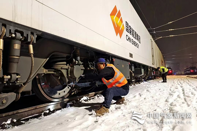 12月12日,国家能源新朔铁路有限责任公司乘务员对列车走行部进行检查。图/薛培刚
