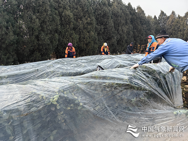 12月12日,在寒潮影响前,山东省日照市五莲县气象局工作人员来到鲁魁茶园开展茶树防冻直通式服务,为茶农送去茶园防冻专题气象服务材料,茶农收到寒潮预警后开展茶树越冬防护。 图/徐浩然 文/孙昊