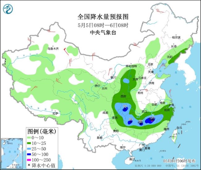 5月4日08时至5日08时,湖北南部和东部、安徽南部、湖南东北部、江西中北部、浙江西部、江苏南部以及山东半岛、辽宁南部、河北东部等地部分地区有大到暴雨,其中,安徽南部、江西北部等地部分地区有大暴雨(100~120毫米)。上述部分地区伴有短时强降水(最大小时降雨量20~40毫米,局地可超过50毫米),局地有雷暴大风等强对流天气。内蒙古中部、黑龙江东北部、新疆南疆盆地、甘肃河西、山东半岛等地部分地区有4~6级风,其中,新疆东部部分地区有8~9级风。渤海、渤海海峡、黄海大部、东海北部海域将有7~8级、阵风9~10级的大风(见图2)。