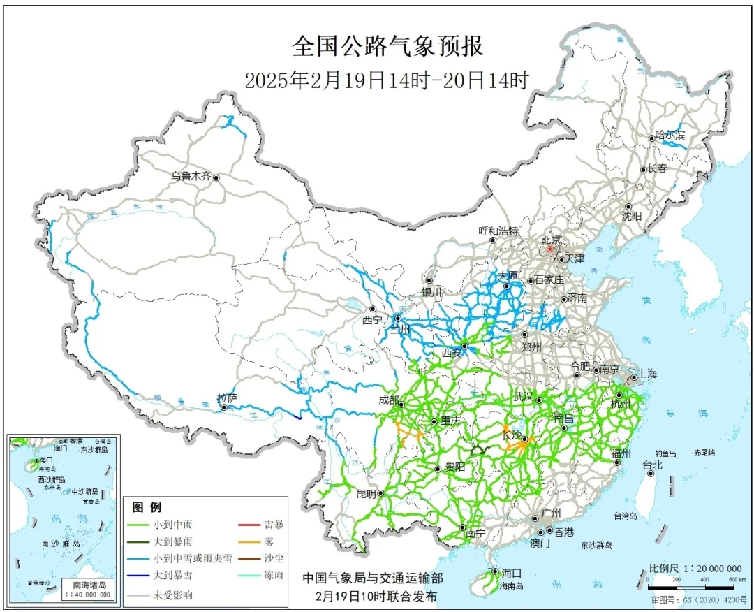 图3 全国公路气象预报图(2月19日14时至20日14时)