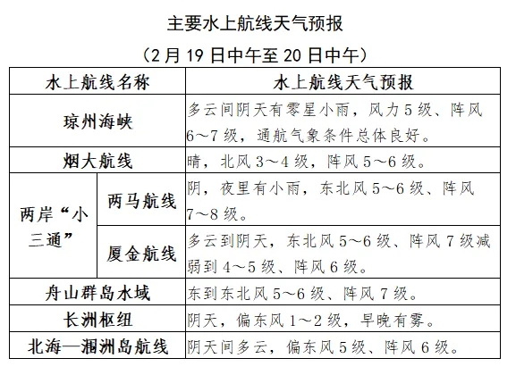预计19日中午到20日中午,琼州海峡,多云间阴天有零星小雨,风力5级、阵风6~7级,通航气象条件总体良好。