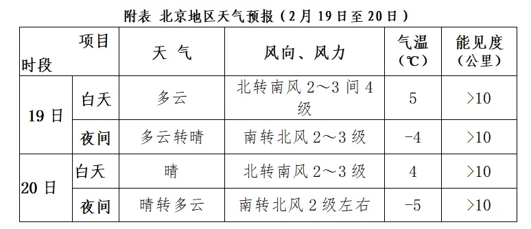 预计19日至20日,北京地区天气多云到晴,风力以2~3级为主,能见度大于10公里。该期间气温较平稳,白天最高气温4~5℃,夜间最低气温-5~-4℃。具体天气预报见附表。