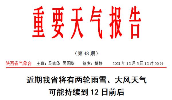 西安市气象台2021年12月5日13时30分发布重要天气报告:受西风槽影响,7日西安将出现一次雨雪、吹风天气过程。