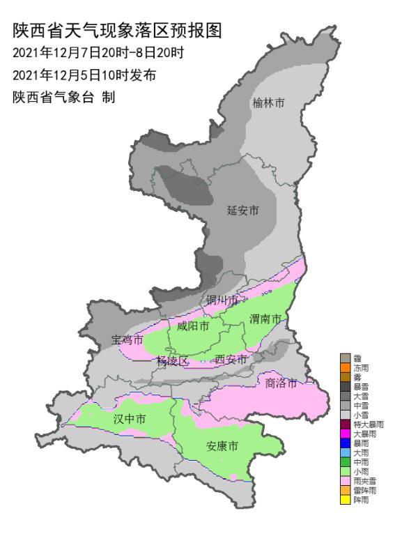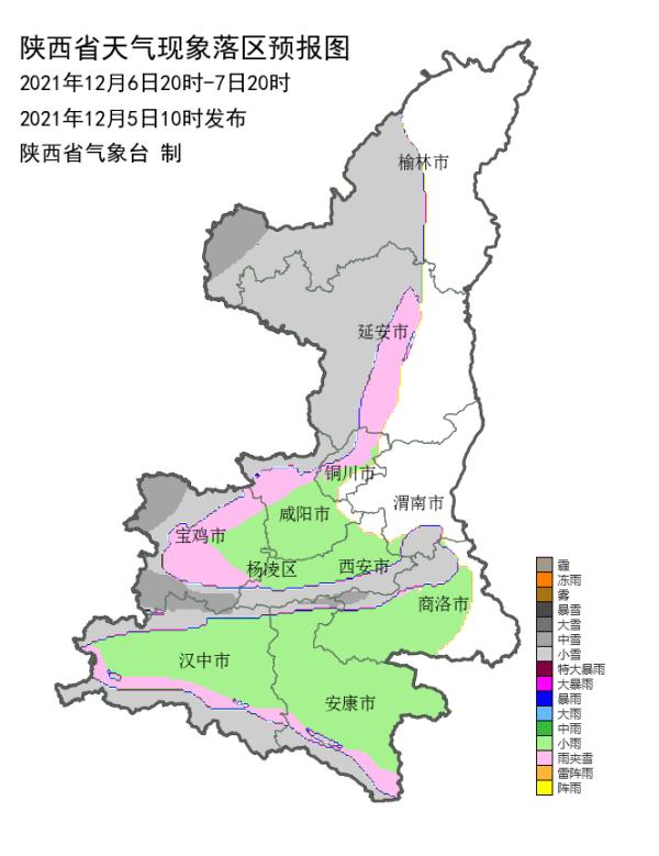 6日晚上至7日白天,陕北部分地方有零星小雪、西部有小到中雪,关中西部、北部及秦巴山区有雨夹雪或小雪、局地中雪,关中南部、陕南大部有小雨。