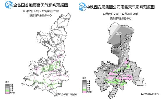 雨雪天气会影响我省大部分公路路段,其中陕北、关中西北部和秦巴山区有降雪,并且气温偏低,容易形成积雪、低能见度和道路结冰,对交通安全产生不利影响。其中,G65(包茂高速)、G20(青银高速)、G22(青兰高速)、G70(福银高速)、G307(岐银线)、G309(荣兰线)、G211(银陕线)等公路以及西平线、梅七线、神朔线、西延线、宝中线、神延线等铁路路段受降雪及道路结冰影响大,交通安全风险等级高,需特别注意防范。此外,陕北、关中北部、商洛大部相关路段风力较大,还需关注横风对车辆通行安全的影响。