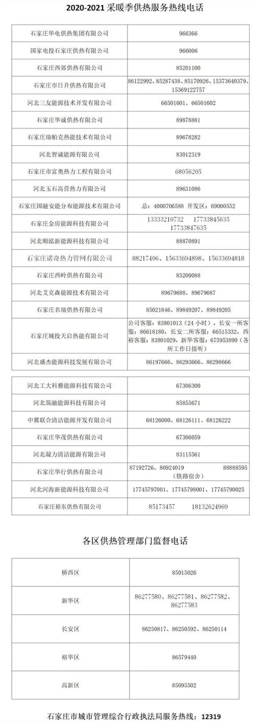 2020-2021采暖季供热服务热线与各区供热管理部门监督电话↓↓↓