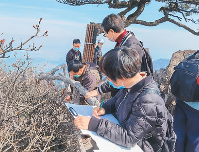 依据相关法规规定,黄山市人民政府、黄山风景区管委会应当构建以生态系统良性循环和环境风险有效防控为重点的生态安全体系,维护风景名胜区生态系统稳定,保持生物多样性、物种原真性。图为2020年4月,科研团队对始信峰、卧云峰区域代表性植物的固定样株生长状况进行检测。