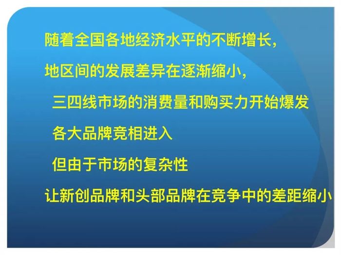 随着全国经济水平增长,各地发展差异在不断缩小,三四线城市的消费量和购买力开始爆发,各大品牌竞相进入,但由于市场的复杂性,让创新品牌和头部品牌竞争差距缩小,之前我们做品牌看到一二线市场,我们觉得农村市场太小,各方面太远无论如何都不想去,但是如果你现在有这种思想来创业的话,你在一二线市场那么多困境那么多挑战就没有办法去成长,我们要把目光放矮一点身段放的小一点来做这个事情。