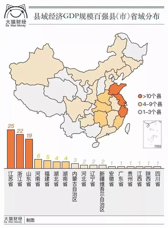 刚刚讲过面临的机遇也好挑战也好,我们再来看下2017年百强县的分布情况,我们的百强县其实有很多的规模超过了很多地级市,甚至有的头部的超过了省会城市,这个县级的消费能力是非常强的,当然这个百强县只能作为我们的参考,由于产业结构不一样,有些百强县消费力没有那么强,但它是一个比较可靠的数据。