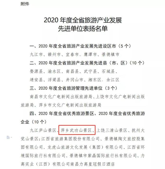原标题:《全市唯一!萍乡武功山荣获“2020年度全省优秀旅游景区”荣誉称号》