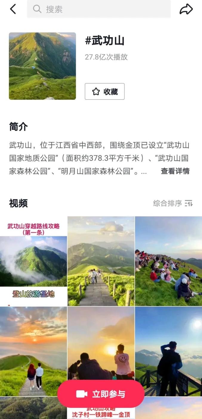 景区紧跟品牌营销新形式,在发力微信、微博运营的同时,积极借助短视频、直播等跨界传播形式,探索品牌营销新形式。截止目前,抖音平台武功山话题点击量突破27.8亿,微博登上热搜第一,阅读量7.7亿,武功山已成为名副其实的网红景区,大大提升了景区品牌知名度和认可度。