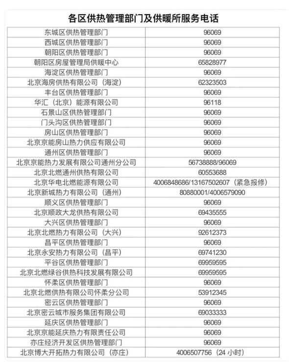 各区供热管理部门及供暖所服务电话。北京市城管委供图