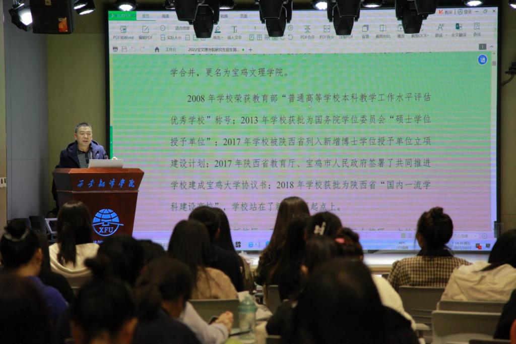 史传龙欢迎西安翻译学院优秀学子报考我校研究生,简要介绍了宝鸡文理学院及外国语学院的办学历史,重点解读了宝鸡文理学院及外国语学院2022年研究生招生章程,讲解了外国语学院研究生培养的特色和优势,分析了学科教学(英语)专业和翻译专硕英语笔译专业的就业趋势等,并回答了部分学生的提问。