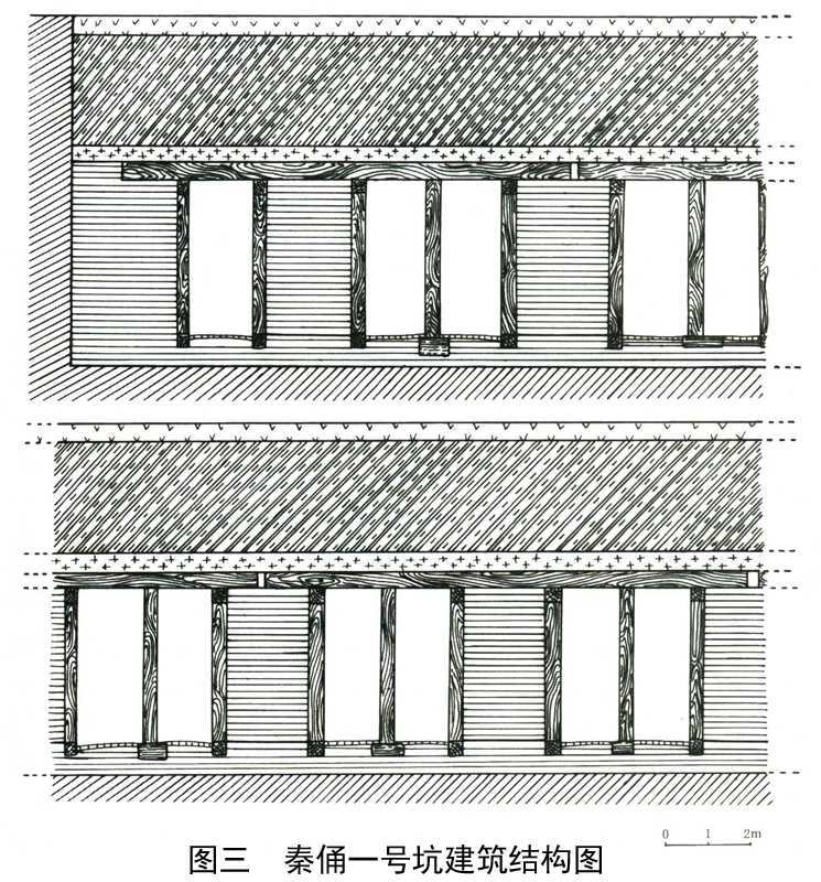 根据近年来在秦陵地区发现的秦兵马俑坑、石铠甲坑、铜车马坑等的结构和形制,可见,秦人对大面积空间的处理,均采用隔墙、过洞的方式。隔墙可起到承重、分割、围护等作用。秦始皇帝陵地宫底部面积东西长约80米、南北宽约50米,面积约4000平方米。我们分析,秦始皇帝陵地宫底部也应该采用了隔墙、过洞的方式进行布局。这种方法,既是传统,又是特征,那么,把这种当时成熟的施工技术,应用到秦陵地宫也不是不可能的。也就是说,地宫底部采用像兵马俑坑一样的隔墙、立柱、棚木结构也是合理的(图三)。