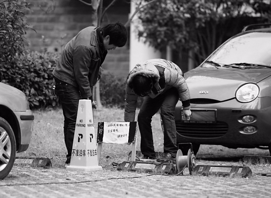 物业工作人员正在修缮停车位。