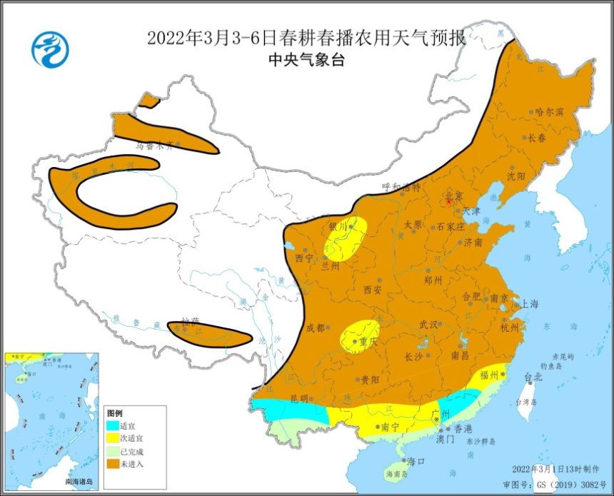 预计3月3-6日,广西、广东、福建及重庆等地部分地区有降水,但雨量不大,气温偏高,气象条件总体对早稻播种育秧、春玉米等旱地作物播种出苗以及春耕备耕工作开展比较有利。西北春播区部分时段风力较大,对春播有一定影响,春耕春播气象条件等级为次适宜(图3)。