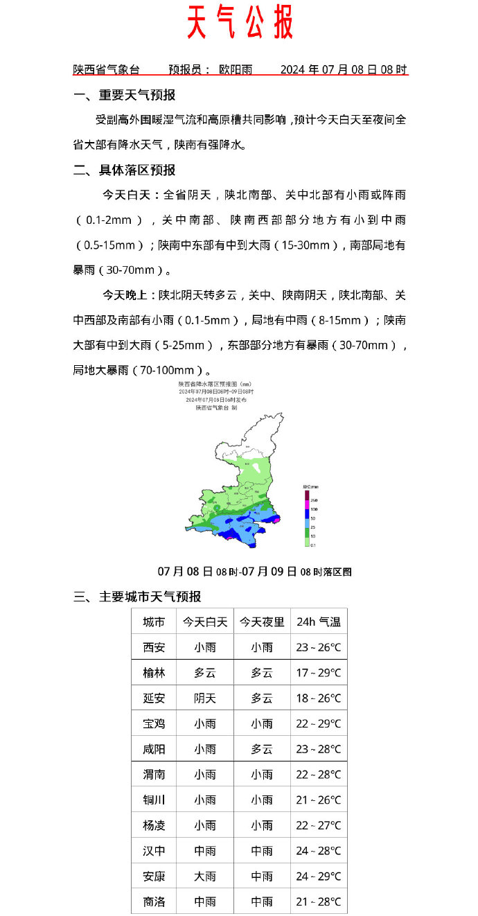 预计7月8日陕北阴转多云,关中、陕南阴天。陕北南部有小雨或阵雨(0.1-2mm),关中、陕南有小到中雨(0.5-15mm),其中关中东部及南部、陕南中东部有大到暴雨(20-70mm)。9日陕北、关中多云间阴天,陕南阴天。陕北南部、关中大部、陕南北部有小雨(0.1-5mm),局地有中雨(10-15mm)。陕南南部有中到大雨(15-50mm),部分地方有暴雨(50-80mm)。10日陕北、关中多云间阴天,陕南阴天。陕北中南部部分、关中西部及南部、陕南北部有分散性小雨或阵雨(0.1-3mm),陕北南部有中到大雨(10-50mm),局地有暴雨(50-70mm)。
