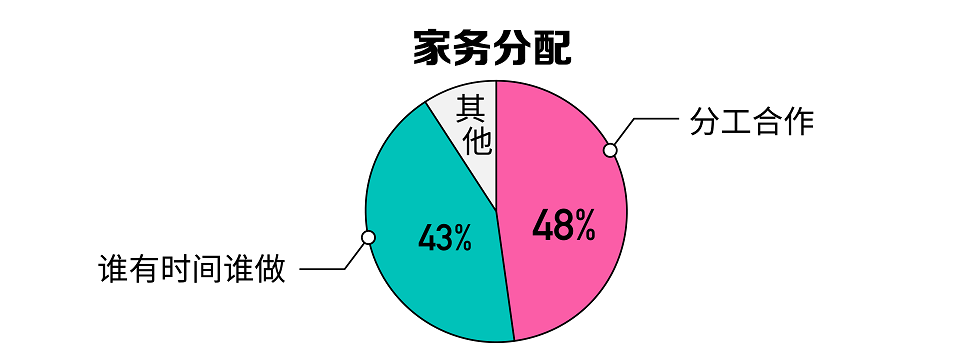 对于家庭收入的理想性别比,5成单身人群认为丈夫应承担主要的经济责任,其次3成认为应夫妻共同承担经济责任。对于家务分配,近半数单身男女支持分工合作或者谁有时间就谁做,而不再是单纯地男生或女生一人包干,男女在家庭中的地位逐渐平等。