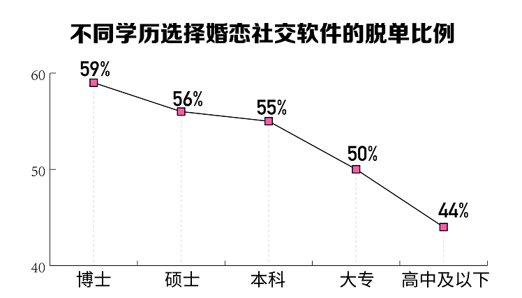 随着社会的发展,单身90后脱单的方式也变得更新颖多样。调查显示,亲戚朋友介绍与婚恋社交软件是当下90后单身青年脱单的主流方式,其次为工作环境接触、相亲活动和泛社交活动。就性别差异来看,超半数(54.27%)男性愿意使用婚恋社交软件,略高于女性(49.42%),而女性更多的是选择信任亲戚朋友的介绍(62.54%)。从学历背景看,学历越高的青年群体更愿意尝试使用婚恋社交软件等新兴方式脱单。