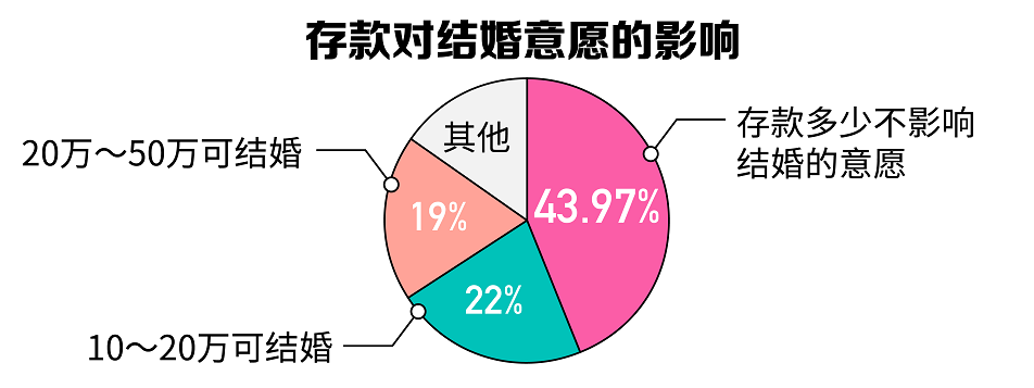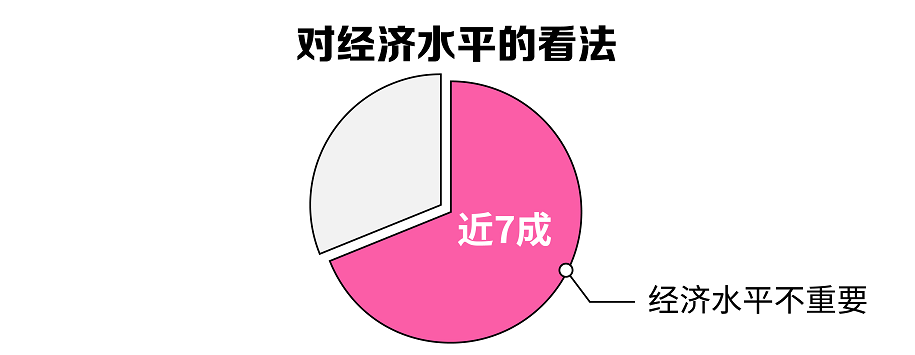 调查显示,近7成90后单身青年认为经济水平不是最重要的择偶标准。近半数(43.97%)90后认为存款多少不影响结婚的意愿;其中,男生(53.87%)认为存款多少不影响结婚的比例高于女性(37%)。在结婚筹备上,女性对经济的考量多过男性。