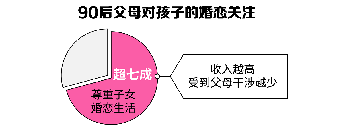 90后的婚恋观发生着变化,他们的父母对此又有怎样的反应呢?调查显示,超7成父母选择尊重子女的婚恋生活,;子女收入越高,在婚恋选择方面受到父母干预越少,这也证明经济独立,可以让单身男女在婚姻方面有更多的话语权。