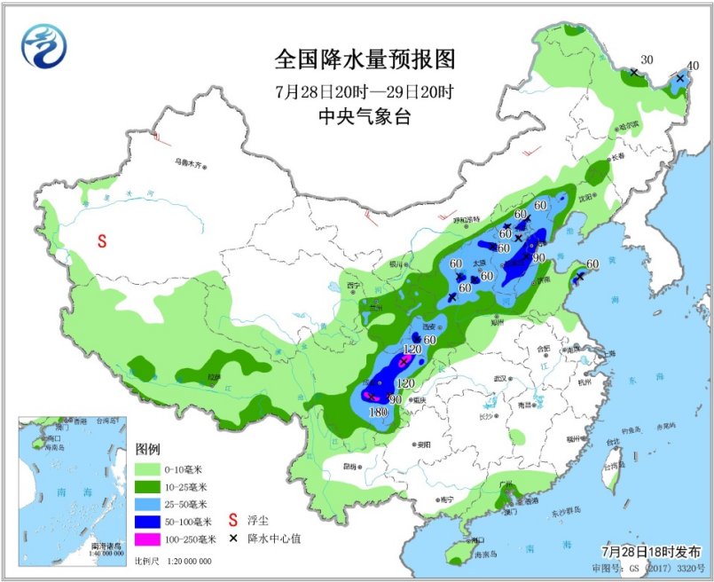 7月28日20时至29日20时,辽宁西部、西藏东部、西北地区东部、华北、黄淮北部、川西高原南部、四川盆地中西部、广东中南部等地部分地区有中到大雨,其中,陕西南部和东部、山西中北部、河北中南部和东部、北京、天津、山东西北部、四川盆地西部等地部分地区有暴雨或大暴雨(100~180毫米)。内蒙古大部、新疆伊犁河谷等地部分地区有4~6级及以上风(见图3)。