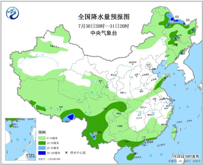 7月30日20时至31日20时,内蒙古东北部、黑龙江、西藏南部和东部、西南地区东北部和南部、华南南部和海南岛等地部分地区有中到大雨,其中,黑龙江西北部等地部分地区有暴雨(50~60毫米)(见图5)。