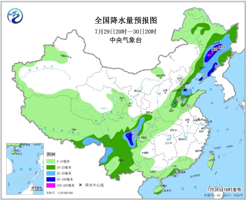 图3 全国降水量预报图(7月28日20时-29日20时)