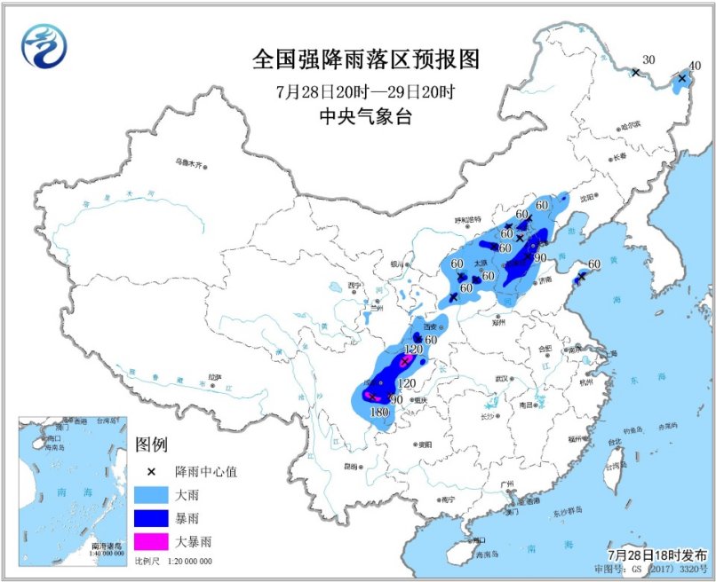预计,7月28日20时至29日20时,甘肃南部、四川盆地中西部、陕西西南部和东北部、山西中北部、河北大部、北京、天津、河南北部、山东西北部、辽宁西南部、黑龙江东北部等地的部分地区有大到暴雨,其中,四川盆地中西部等地局地有大暴雨(100~180毫米),上述部分地区伴有短时强降水(最大小时降水量20~50毫米,局地可达60毫米以上)、局地有雷暴大风等强对流天气。中央气象台7月28日18时发布暴雨蓝色预警(见图1)并继续发布强对流天气蓝色预警。
