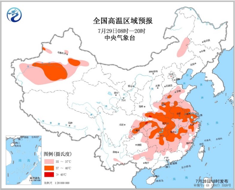 预计7月29日白天,黄淮中西部、江淮、江汉、江南大部、华南北部、四川盆地东部、贵州东部、新疆南疆盆地等地最高气温达35℃,其中,河南东部和南部、安徽中北部、江苏南部、湖北大部、湖南中北部、江西中北部、浙江中北部、四川盆地东部、新疆南疆盆地等地的部分地区最高气温达37~39℃,湖北西北部、重庆东北部局地可达40℃以上。中央气象台7月28日18时继续发布高温橙色预警(见图2)。