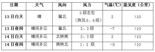 预计13日至14日,北京地区天气以晴为主,13日白天有3级左右偏北风,阵风5 、6级。期间能见度总体较好,气温较低。具体预报如下: