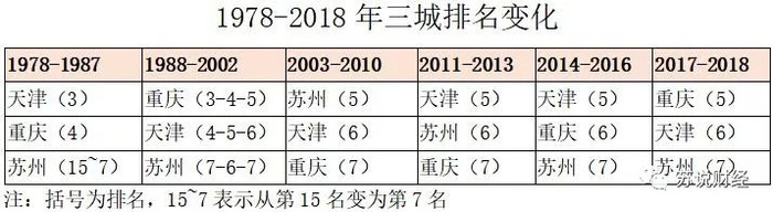 追溯历史数据,苏州是落后于天津、重庆的。1978年,天津排名第三,重庆紧随其后,而苏州与重庆中间则隔了10个城市。