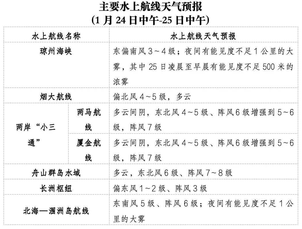 25日白天至夜间,东海大部、台湾海峡、台湾以东洋面、巴士海峡、南海北部、北部湾将有6~8级、阵风9级的东北风。25日夜间至26日早晨,琼州海峡、雷州半岛沿岸海域将有能见度不足1公里的大雾。