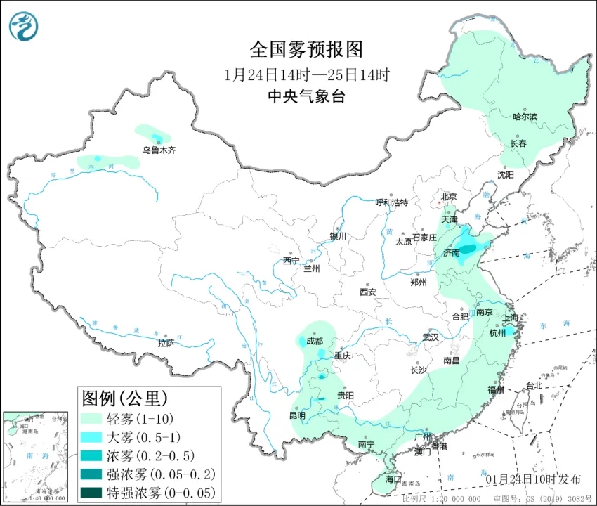 图1 全国雾预报图(1月24日14时-25日14时)