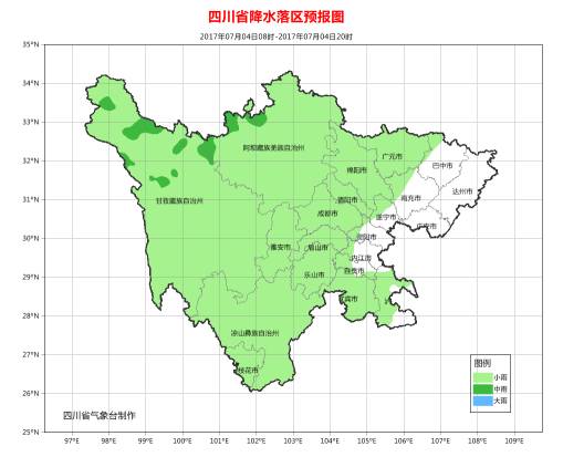 4日晚上到5日白天:达州、广安、泸州、宜宾4市阴天,盆地其余地方阴天有阵雨或雷雨,雨量小到中雨,其中广元、绵阳、德阳、成都4市有大雨到暴雨,局部有大暴雨;川西高原和攀西地区阴天有阵雨或雷雨,其中川西高原大部有中雨。