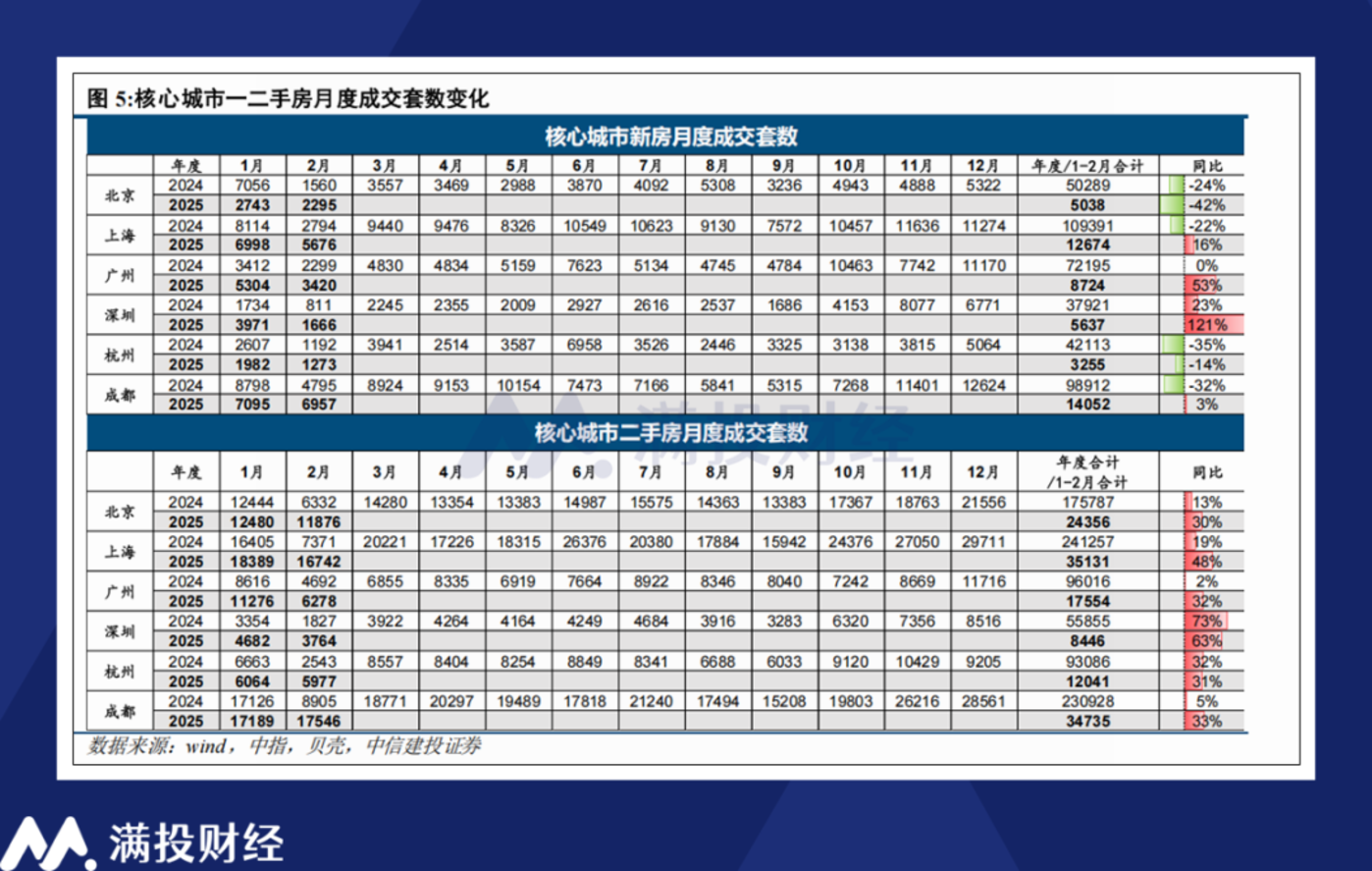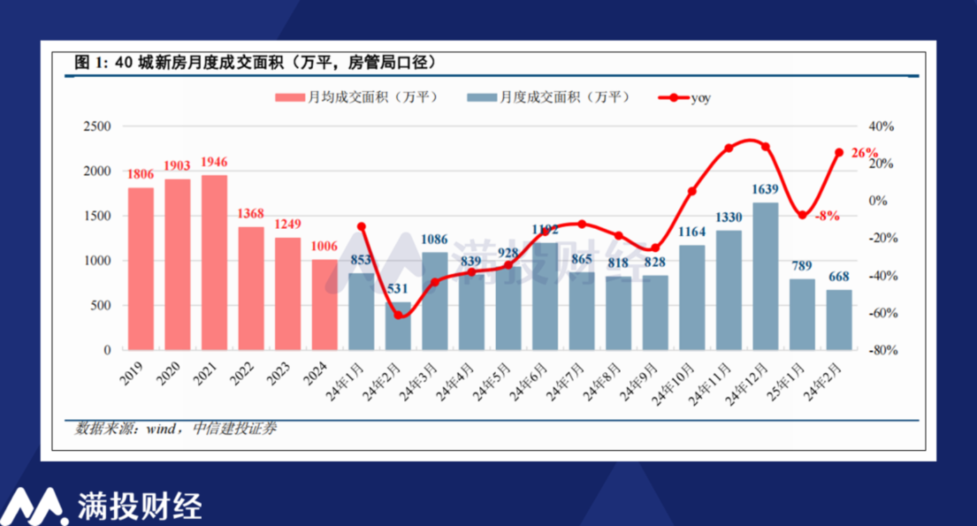 根据中信建投研报数据显示,2025年1-2月,全国重点40城新房累计成交面积为1456万平,同比增长5%,2月单月成交面积达到668万平方米,同比增长26%。考虑到2024年春节假期位于2月,因此今年2月的同比增速表现较为亮眼,但整体来说,25年春节过后的新房成交延续了2024年四季度以来的止跌回稳趋势。