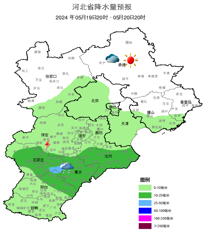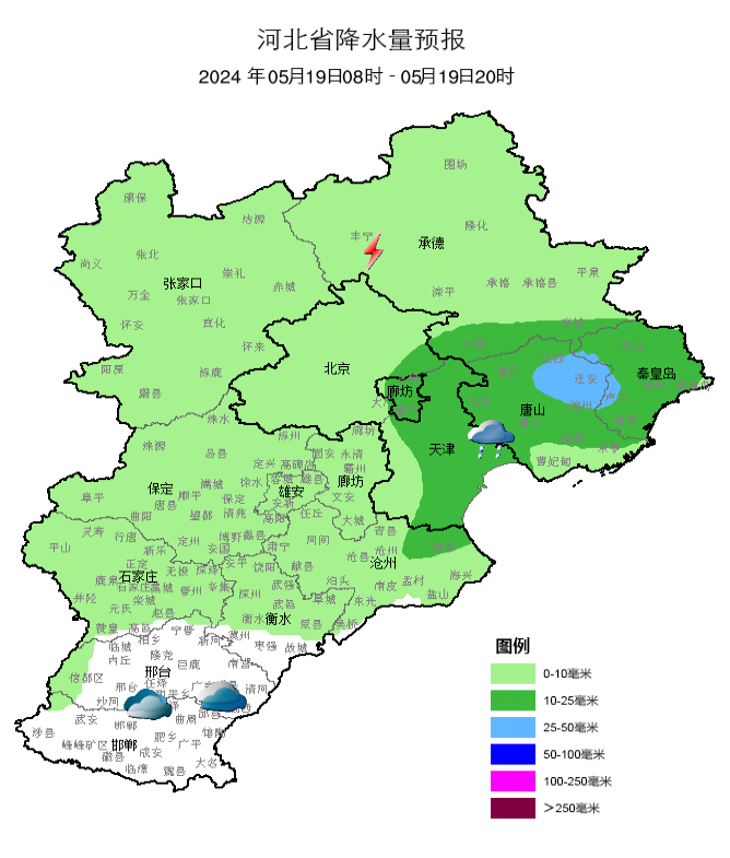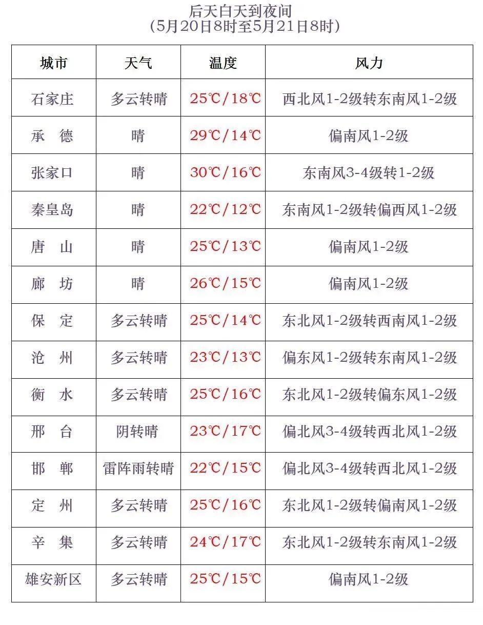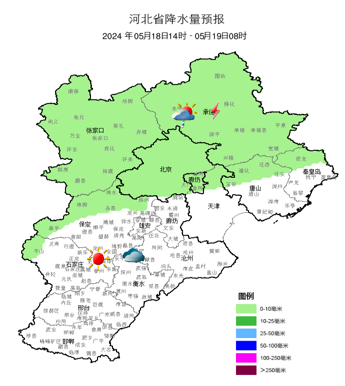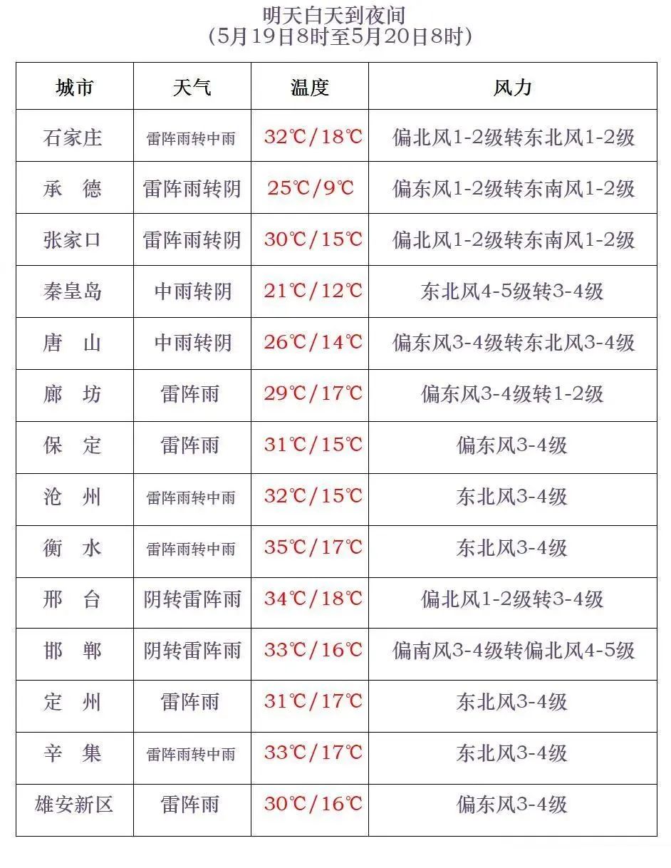 明天白天,全省多云转阴,石家庄、衡水及以北地区和邢台西部有雷阵雨或阵雨,其中承德东部、唐山、秦皇岛、廊坊北部、沧州的部分地区有中到大雨,个别地点有暴雨,雷雨时局地伴有短时大风、短时强降水等强对流天气,个别地点有冰雹。