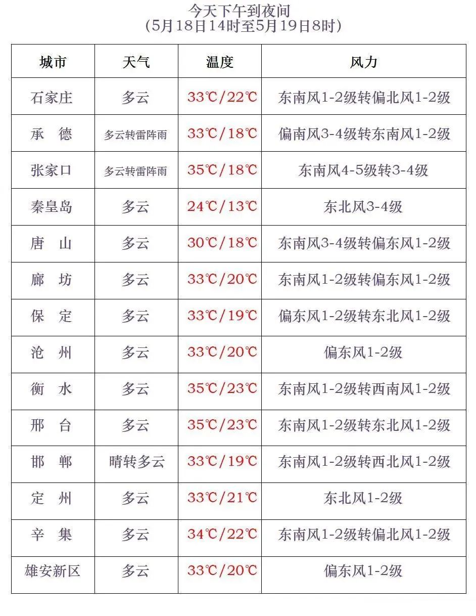今天下午到夜间,张家口、承德、唐山北部、秦皇岛北部、保定北部、廊坊北部、石家庄西部晴转阴有雷阵雨或阵雨,雷雨时局地伴有短时大风、短时强降水等强对流天气,个别地点有冰雹,其他地区晴转多云。