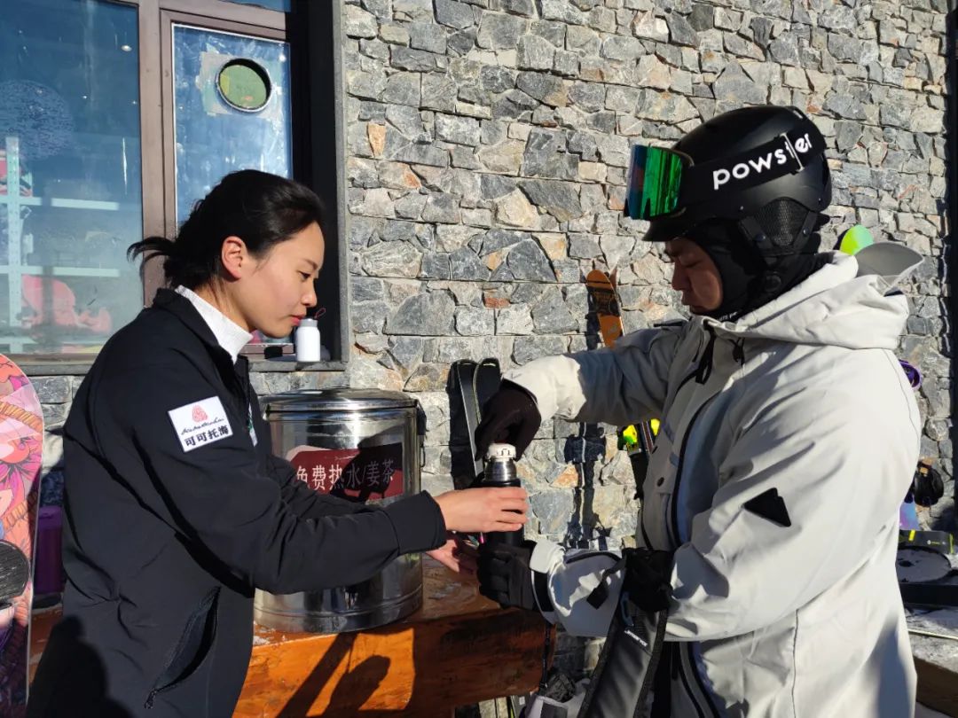 “在可可托海滑雪,能欣赏到最美的雪景,能体验到最优的雪质。面对最近一段时间的寒冷天气,我们更是感受到了雪场无微不至的暖心关爱,无论是在雪具大厅还是在换道休息点,都提供了免费的姜枣茶、烘干机、药箱等,特别的贴心!”来自北京的雪友刘晨竖起大拇指说。