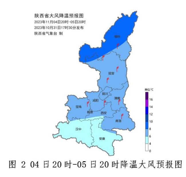 5日日平均气温陕北北部下降8~10℃,陕北南部、关中、商洛下降6-8℃,汉中、安康下降4℃左右。最低气温出现在6日凌晨,陕北-7~-5℃,关中北部、秦岭山区-3~-1℃,关中南部、陕南4~9℃。5日最高气温,陕北5~16℃,关中10~18℃,陕南13-19℃。陕北、关中北部、商洛、秦巴山区有5~6级偏北风,阵风7~8级,关中南部3-4级偏西风,陕北、关中北部有扬沙或浮尘天气。
