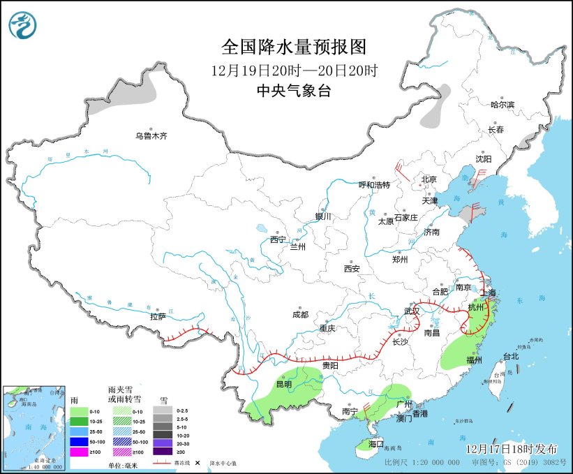 图6 全国降水量预报图(12月19日20时-20日20时)