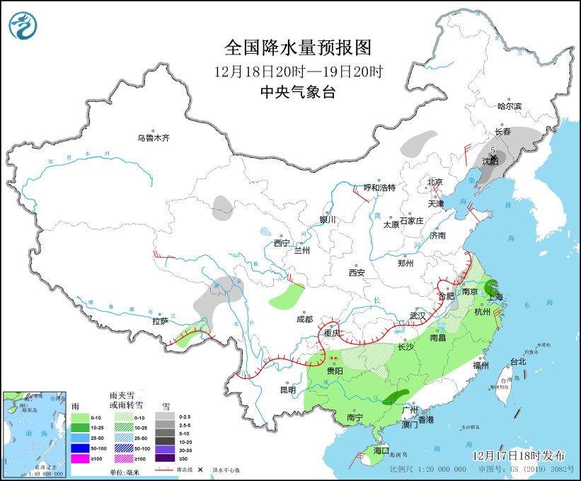 12月18日20时至19日20时,辽宁中东部、吉林东南部、苏皖中南部、江西西部、湖南东北部、贵州中东部等地部分地区有小雪或雨夹雪,其中,辽宁中部等地局地有中到大雪(5~6毫米)。江南中南部、贵州南部、福建西部和北部、广西大部、海南岛等地部分地区有小雨。辽东半岛、河北北部、山东半岛、浙江北部等地部分地区有5~6级风(见图5)。