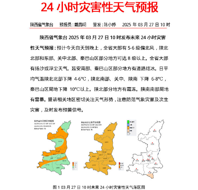 陕西省气象台2025年03月27日10时发布未来24小时灾害性天气预报:预计今天白天到晚上,全省大部有5-6级偏北风,陕北北部和东部、关中北部、秦巴山区部分地方可达8级以上。全省大部有扬沙或浮尘天气。延安南部、秦巴山区部分地方有道路结冰。日平均气温陕北北部下降 4-6℃,陕北南部、关中、陕南下降 6-8℃,秦巴山区局地下降 10℃以上。陕北部分地方有霜冻。陕南南部局地有雷暴。提请相关地区密切关注天气形势,注意防范气象灾害及次生灾害,及时发布预警信号。