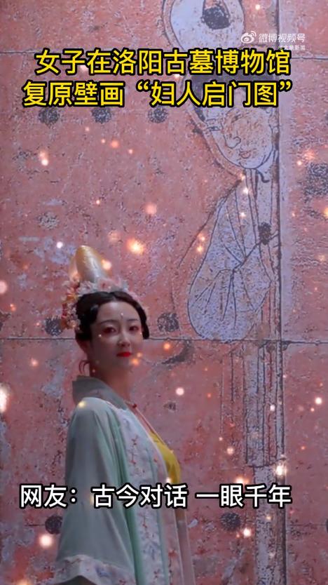 6)近日,河南洛阳95后女子复原洛阳古墓博物馆内《妇人启门图》壁画,服装考究,妆容精致,在古今对话中演绎神都洛阳的神秘故事,引众多网友点赞。
