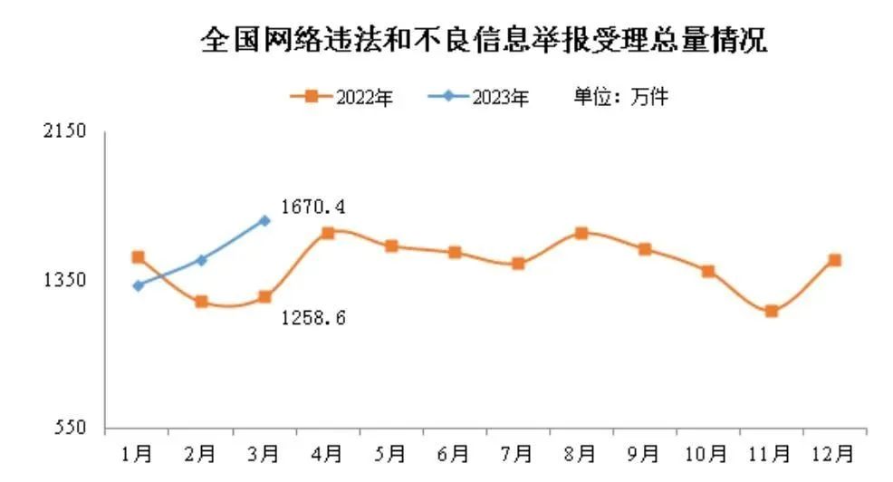 15)据中央网信办举报中心,2023年3月,指导全国各级网信举报工作部门、主要网站平台受理网民举报色情、赌博、侵权、谣言等违法和不良信息1670.4万件,环比增长14.4%、同比增长32.7%。